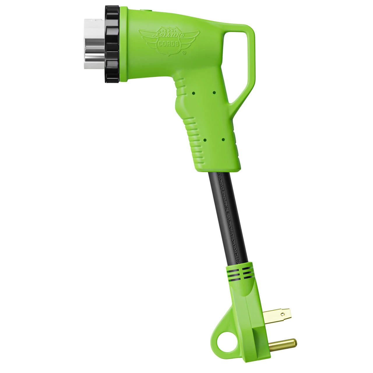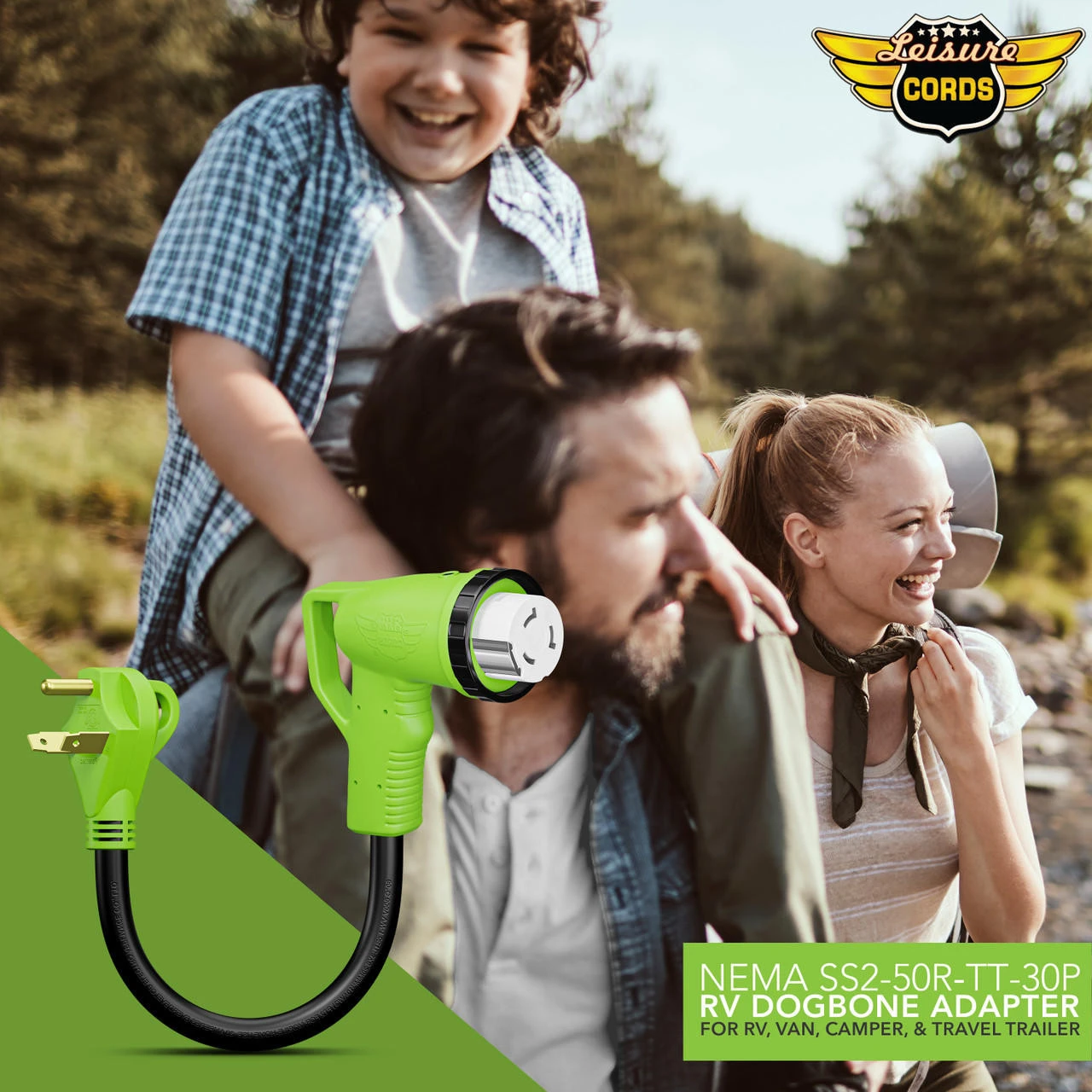Remember your Leisure Cords 12″ 90-Degree Dog-Bone Adapter, and forget your worries about power while traveling. Its the perfect tool to keep in your RV for your next trip. Use it to hook up your 50-Ampere to a 30-ampere power source. The 90-degree angle is specifically designed to reduce strain on the cord. Our RV adapter allows for an easier install in hard-to-get places. The female end has a sturdy handle and a LED power indicator light, and it is manufactured with a threaded twist receptor that creates a weatherproof connection that locks and keeps the adapter in place.