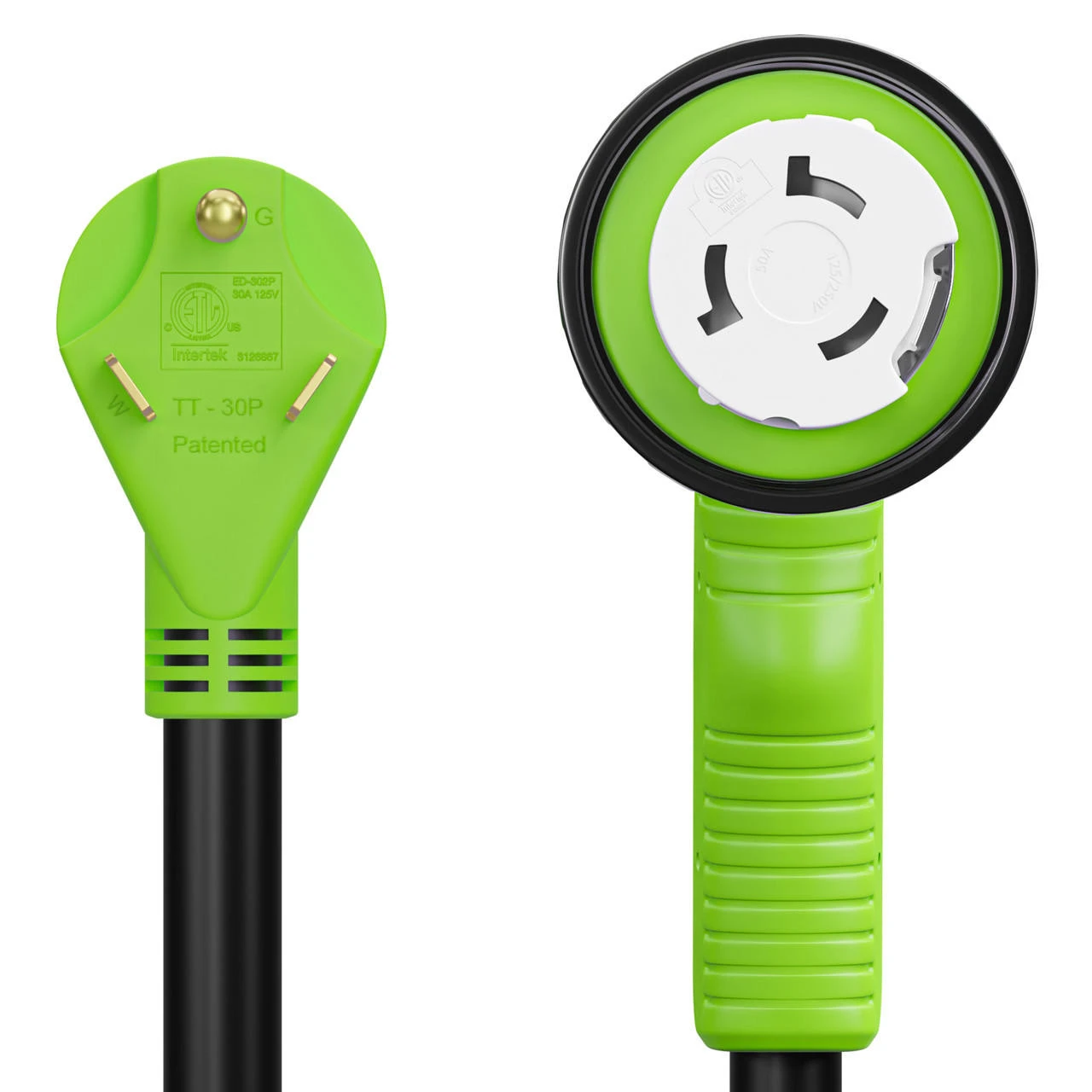 12″ 90-Degree Dogbone RV Adapter 30 Amp Male And 50 Amp Female With Twist Lock And LED Power Indicator (30 Amp Male – 50 Amp Female Twist)