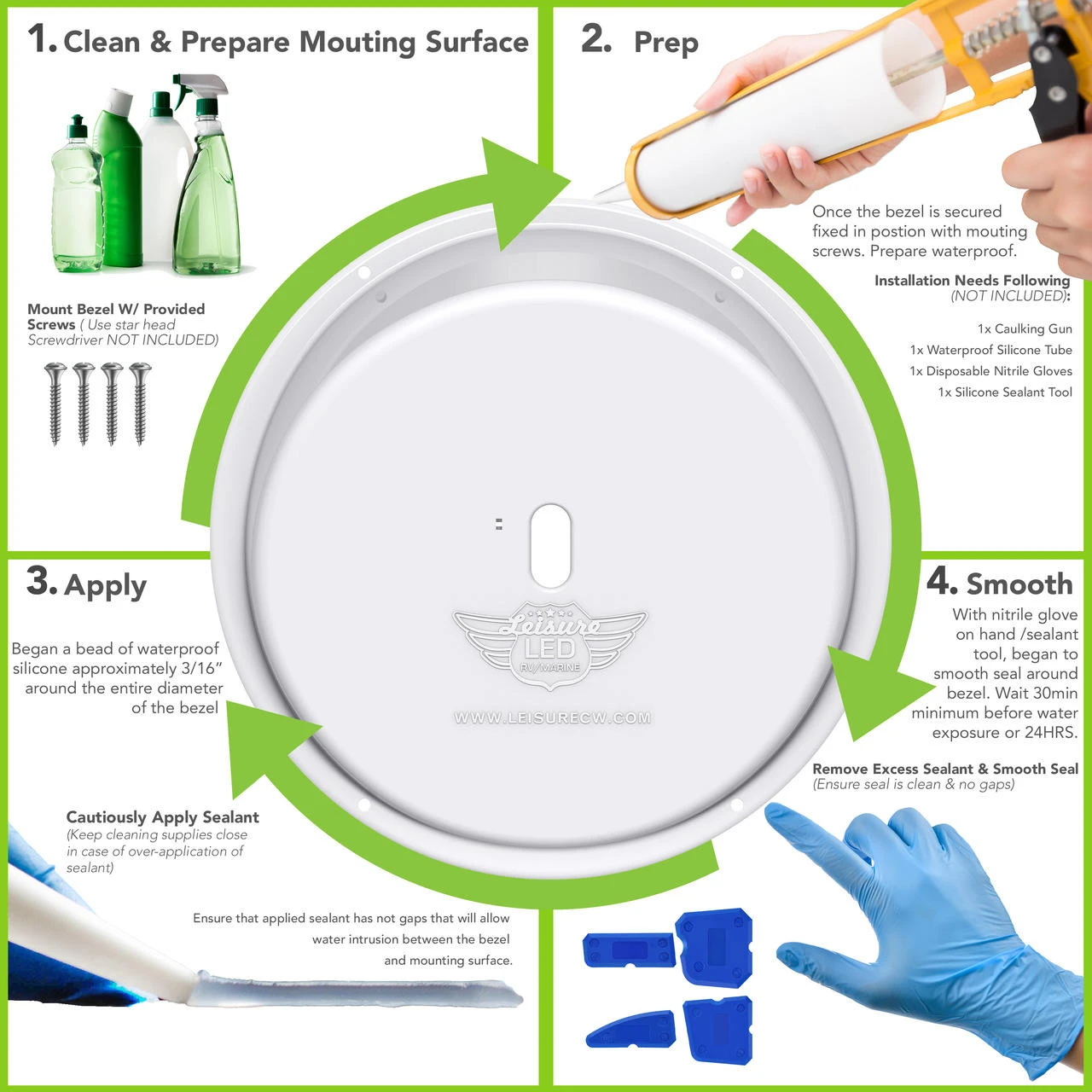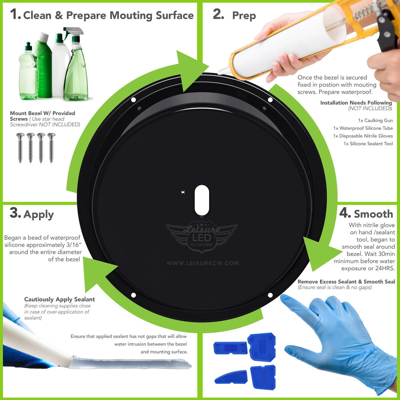 The angled bezel is made of UV-treated plastic for a strong, durable, long-lasting product. At Leisure, we stand behind our products with a one-year warranty. Contact us at Leisure Coachworks with any questions or to get advice on RV repairs, service, or upgrades from our team of professionals.