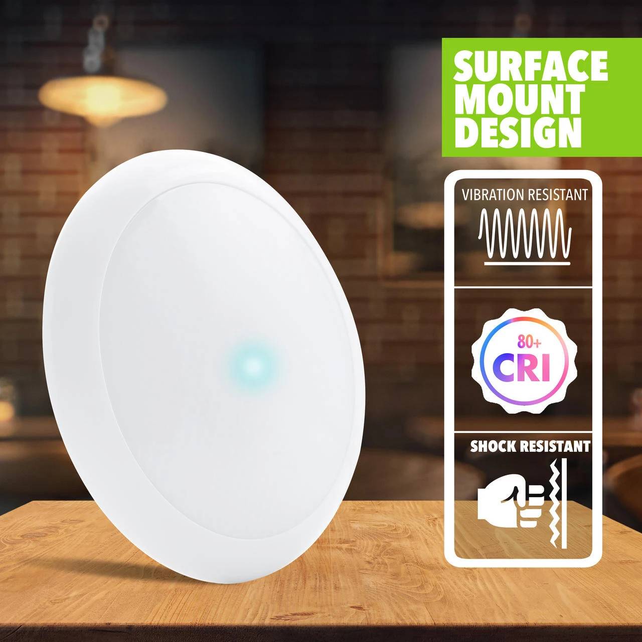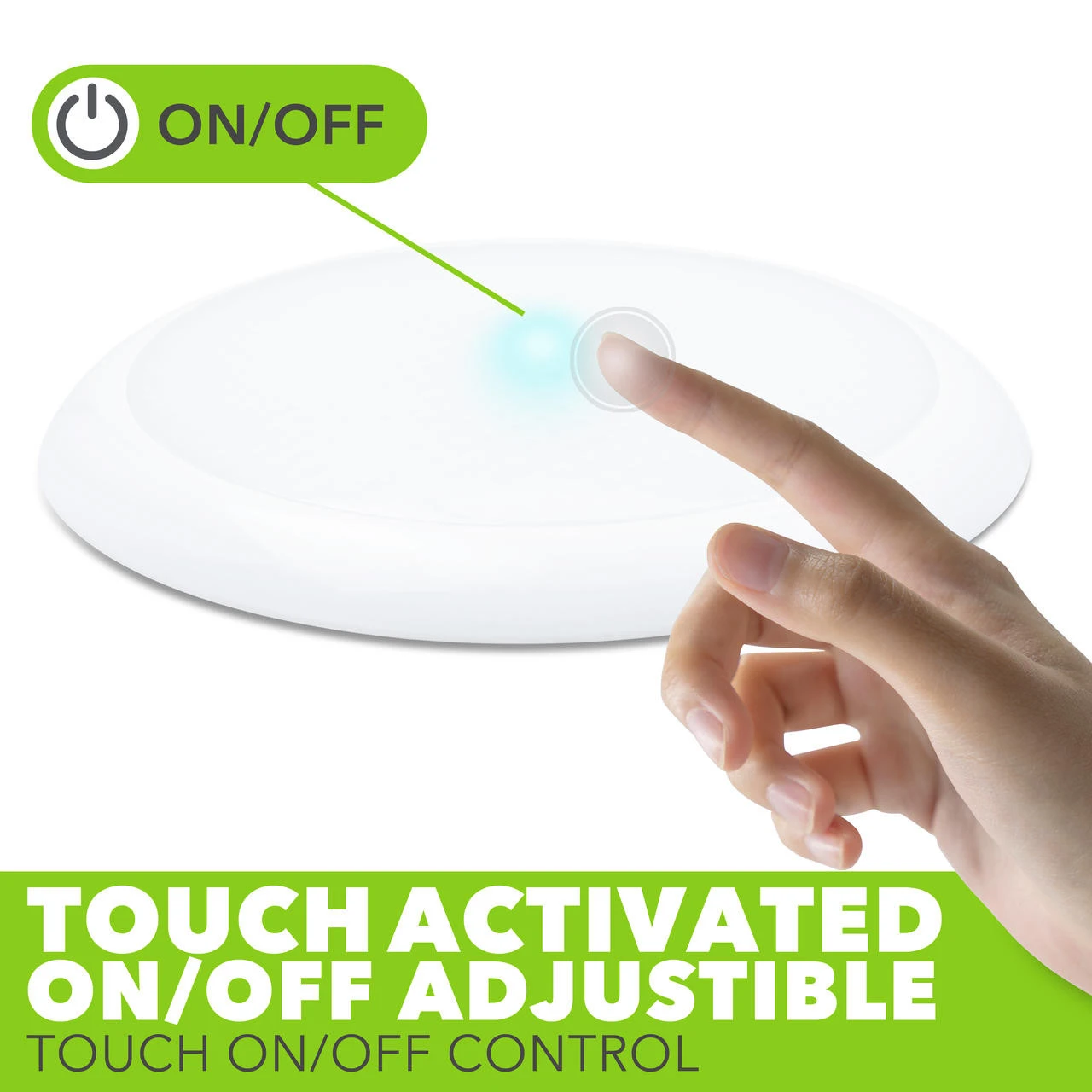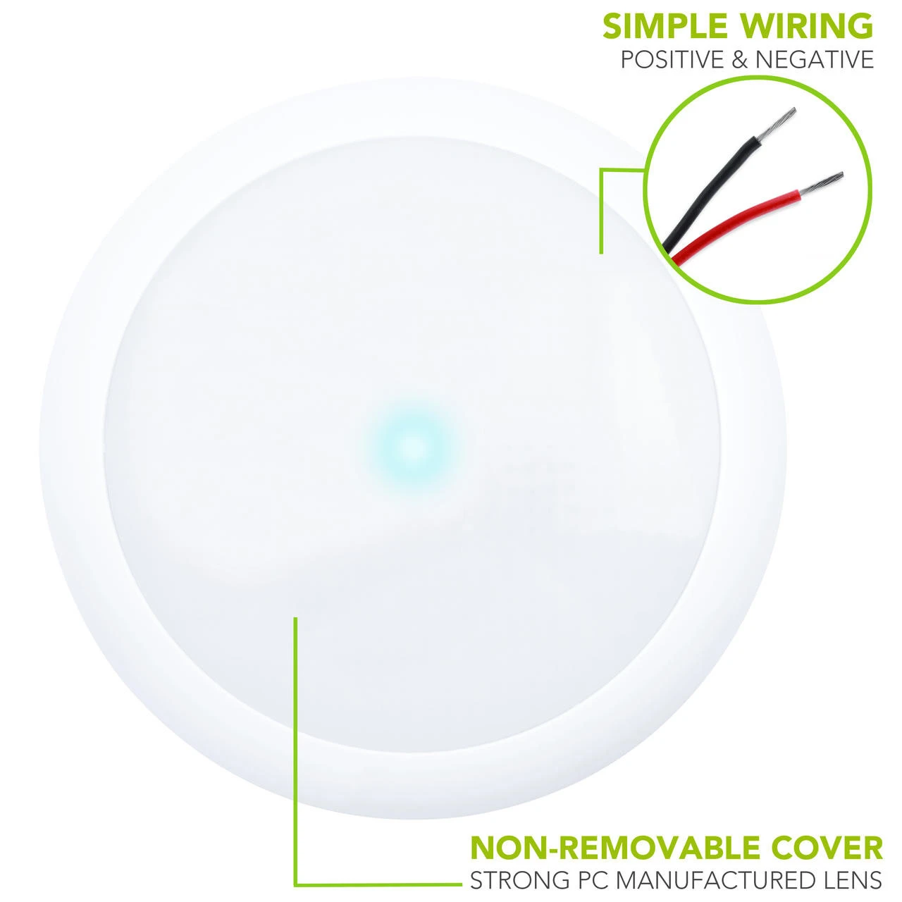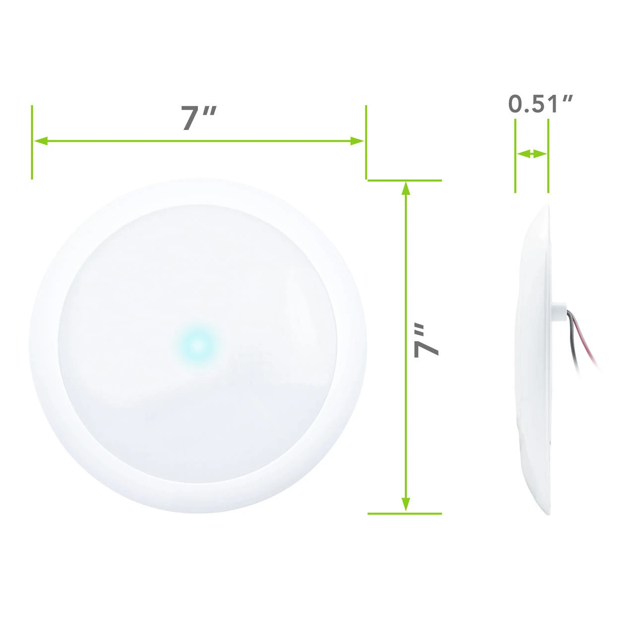 Leisure LED Super Slim Surface mount 7″ 750 Lumen with Touch on/off feature- Ultra thin, thickness 0.51″, lightweight and compact body fits narrow places. Shock and vibration resistant. Available in Warm, Natural and Cool White. Touch Center of Light lens to turn off and on. No Need to cut out a unwanted hole, these are surface mount. Size: Dia 7″ x .51’’H. Surface Mount Design Make it more Safe and Easy Installation with Only 3 Screws (Included). 2 Wire Designed – Black Wire=Positive (+), White Wire= Negative (-). Convenient ON/OFF Touch Switch Design it adds great functionality to any area for lighting and it is widely used as perfect replacement light for Car/RV/Trailer/Camper/Motorhomes/Marine Boats. Lower Power Consumption & High Energy Efficiency