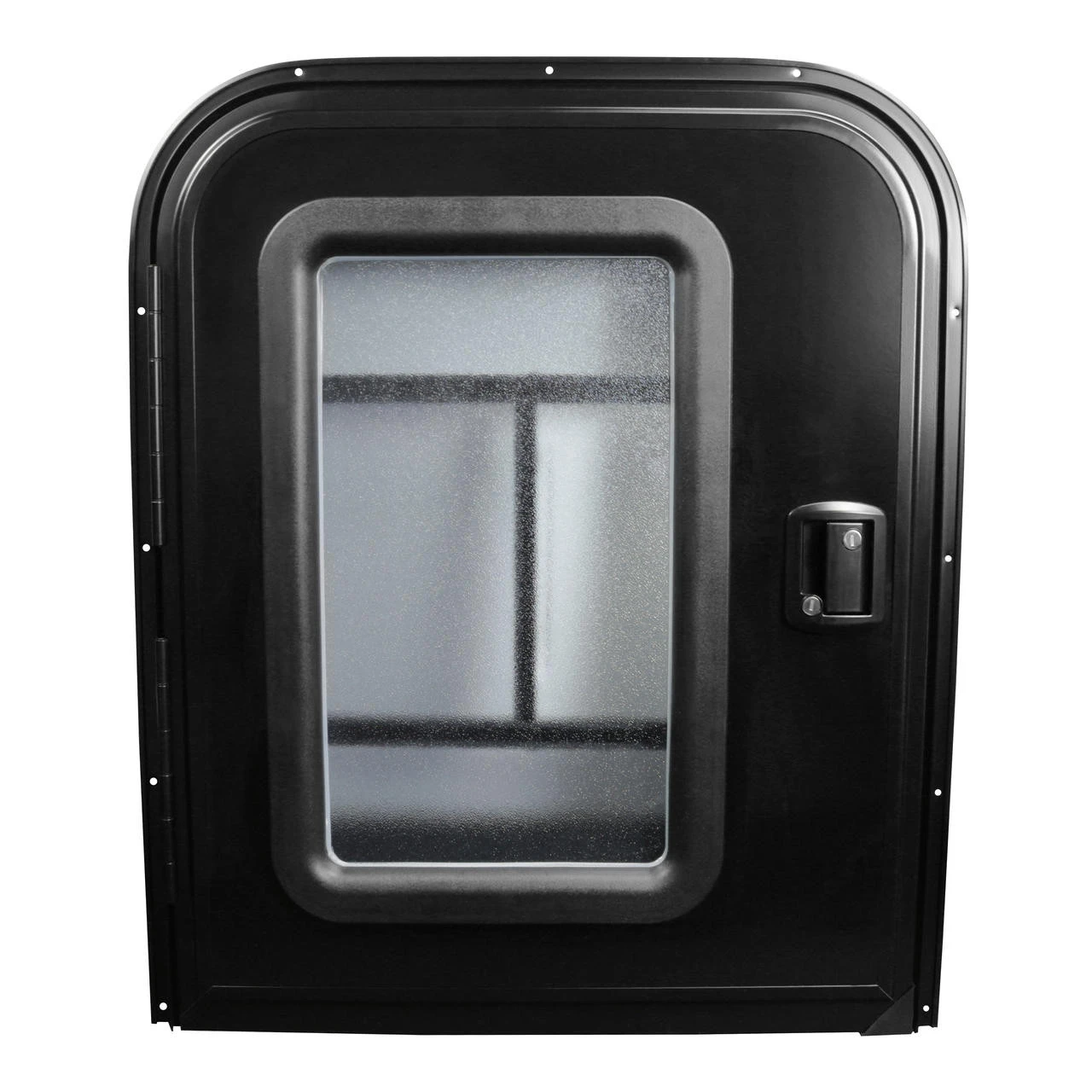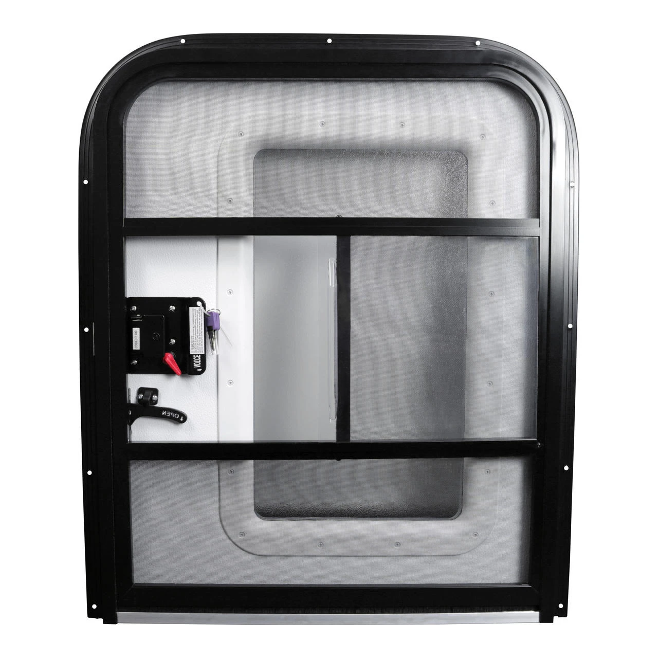 This entry door is designed for these special small RVs and can be installed on either the driver’s side or the passenger’s side. The door comes in black and comes with a widow with a screen door and a slider panel.