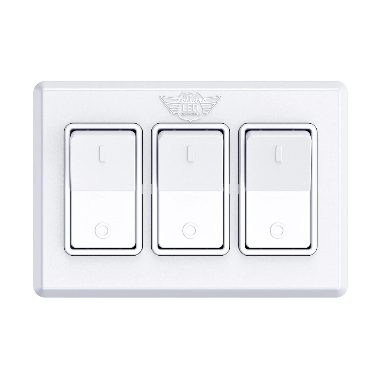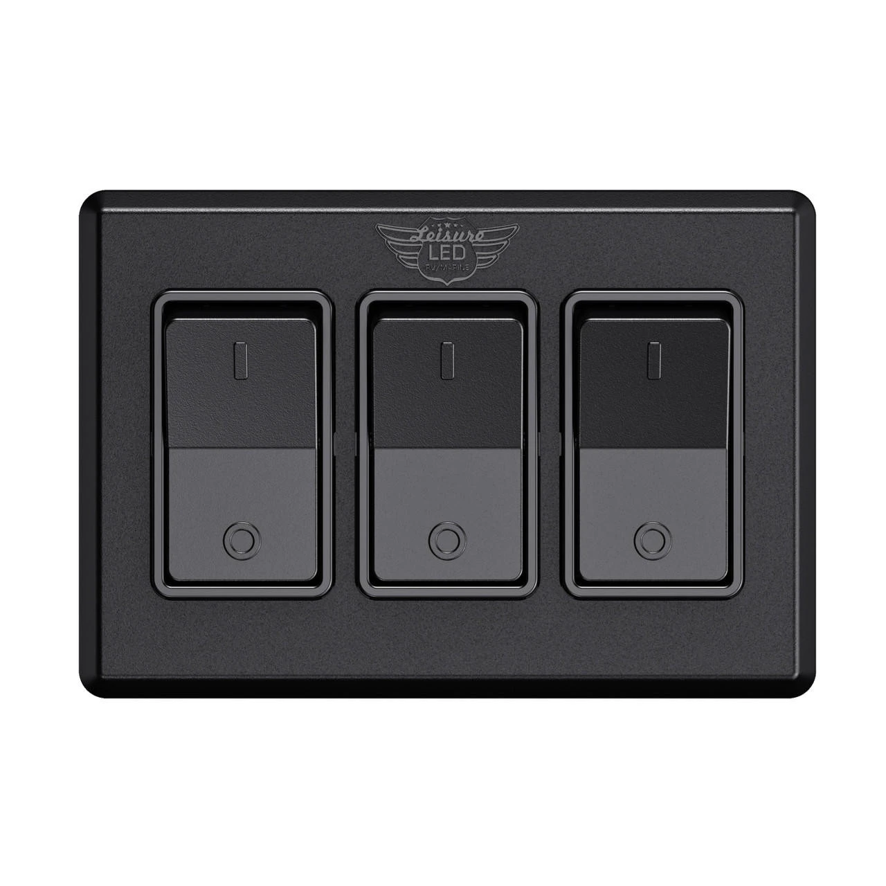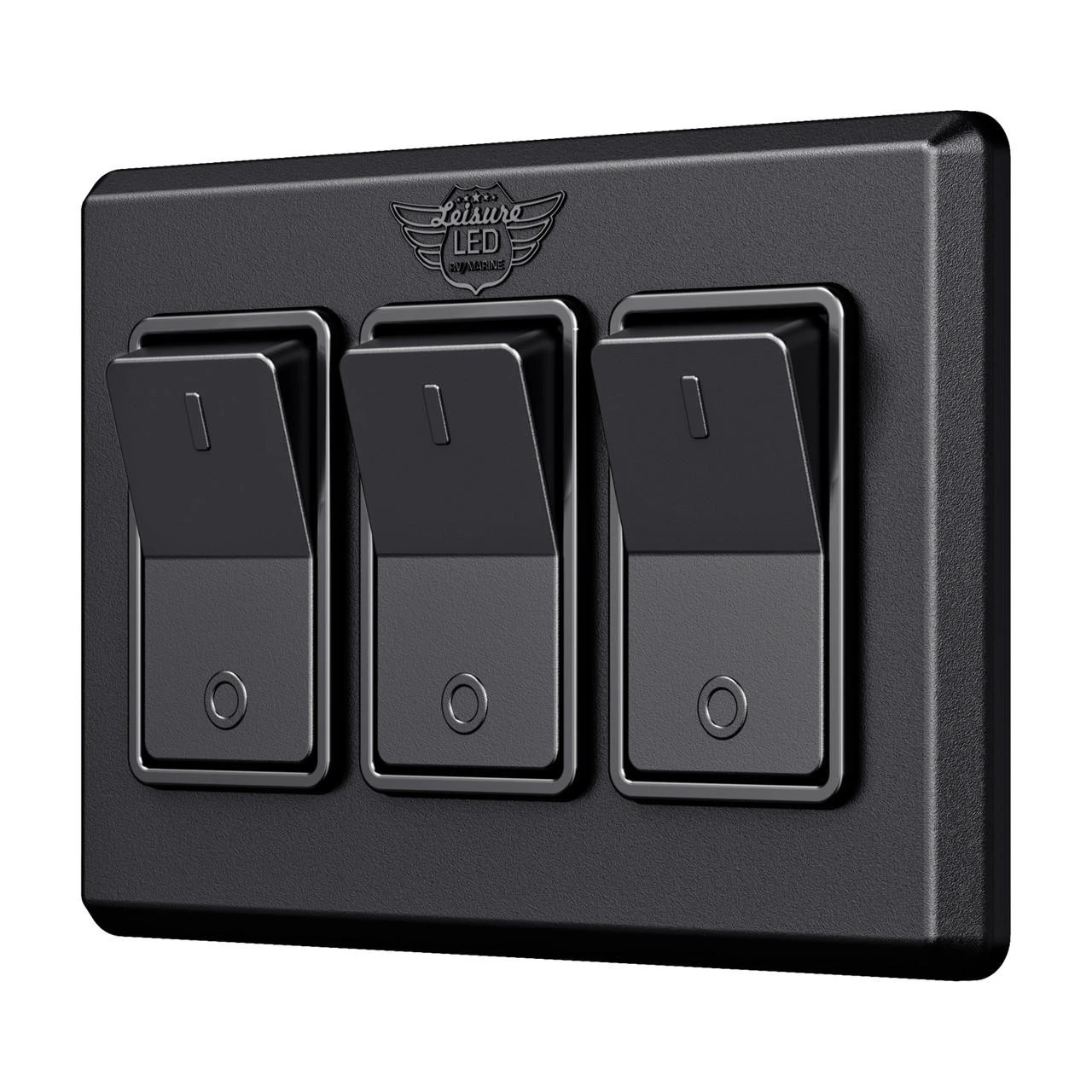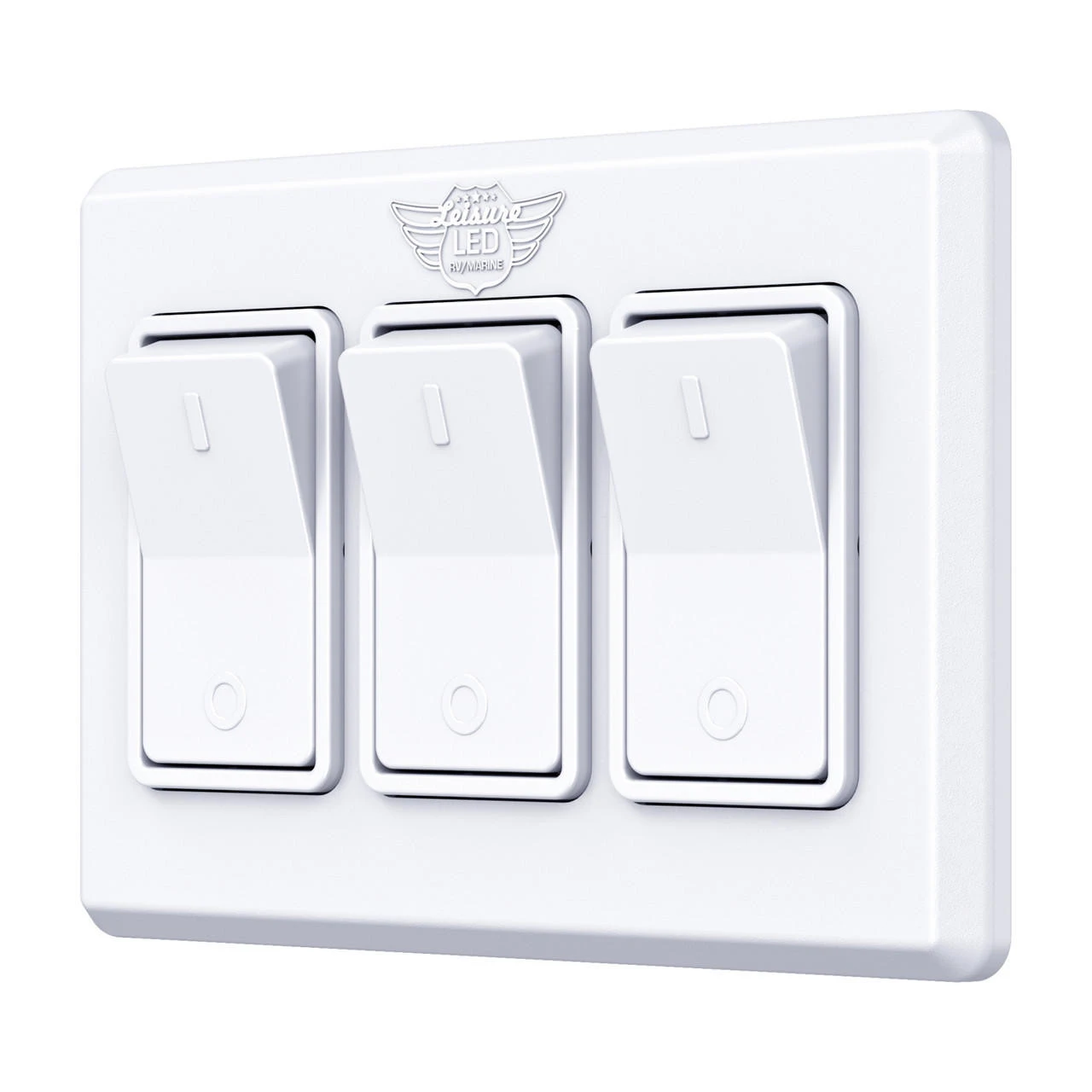 (1) RV 3 gang 12 volt light switch -Cover snaps over switch base plate for a clean look and easy installation and service – Includes 1 switch base and cover with on-off switch’s (as shown) -Overall Size: 2.87″ (L) X 4.16″ (W) X 1.1″ (H) -Minimum hole cut out size 3.28” (L) X 1.71” (W) X 0.54” (H)- Commonly used for lights, pumps, fans, vents and many other uses in RVs, Buses, Horse Trailer Conversions, Haulers, Travel Trailers, Boats and more.