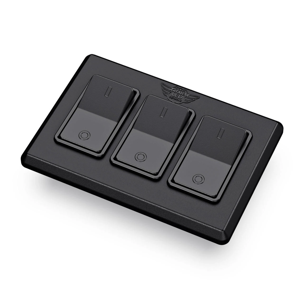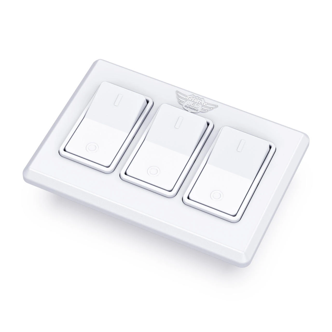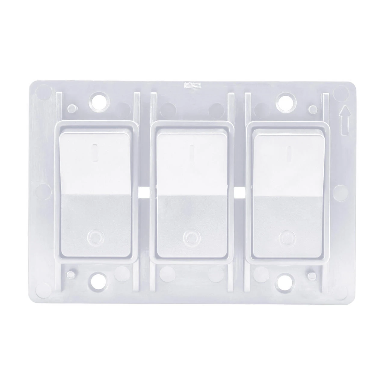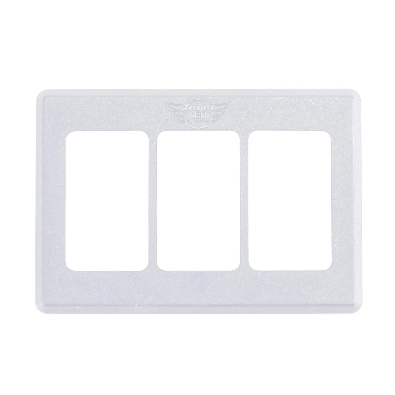 (1) RV 3 gang 12 volt light switch -Cover snaps over switch base plate for a clean look and easy installation and service – Includes 1 switch base and cover with on-off switch’s (as shown) -Overall Size: 2.87″ (L) X 4.16″ (W) X 1.1″ (H) -Minimum hole cut out size 3.28” (L) X 1.71” (W) X 0.54” (H)- Commonly used for lights, pumps, fans, vents and many other uses in RVs, Buses, Horse Trailer Conversions, Haulers, Travel Trailers, Boats and more.