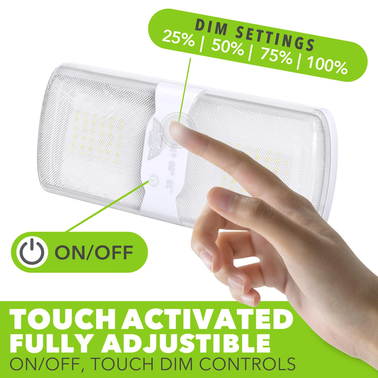 - Innovative Touch Pad Dimmer: Touch Pad enables adjustment of light output;  25%, 50%, 75% and 100% illumination. Our Light adds great functionality to any area for lighting and it is widely used as perfect replacement light for Car/RV/Trailer/Camper/Motorhomes/Marine Boats.