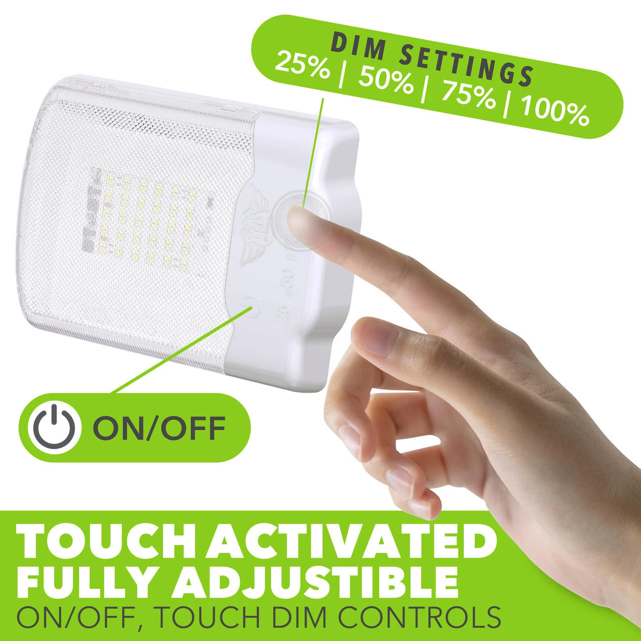 - Innovative Touch Pad Dimmer:Â Touch Pad enables adjustment of light output; 25%, 50%, 75% and 100% illumination. Our Light adds great functionality to any area for lighting and it is widely used as perfect replacement light for Car/RV/Trailer/Camper/Motorhomes/Marine Boats.