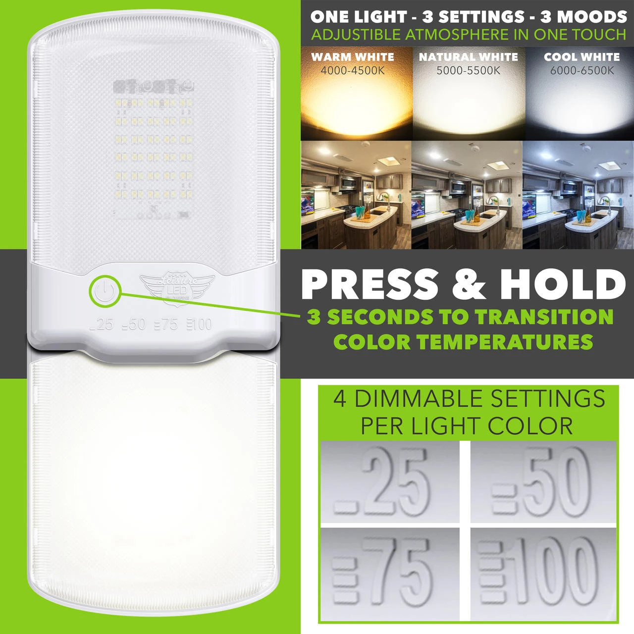 This versatile light fixture is an ideal addition or replacement fixture for your coach, 5th wheel, or marine boat. You can have exactly the light you want with the simple touch of a button.