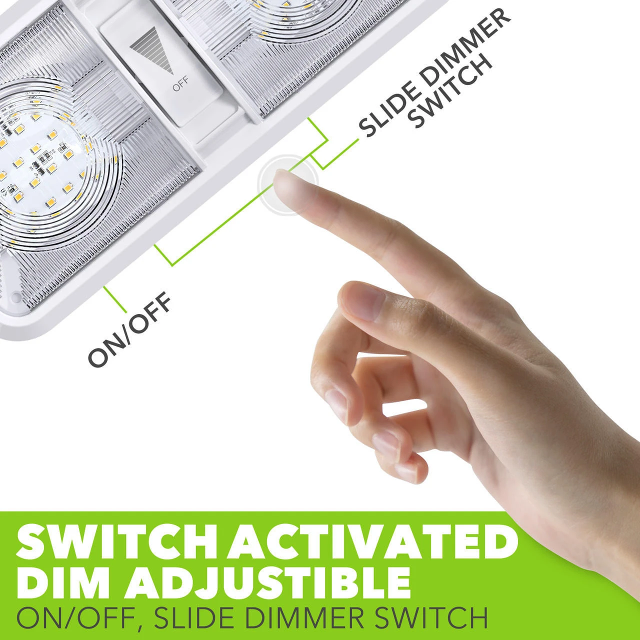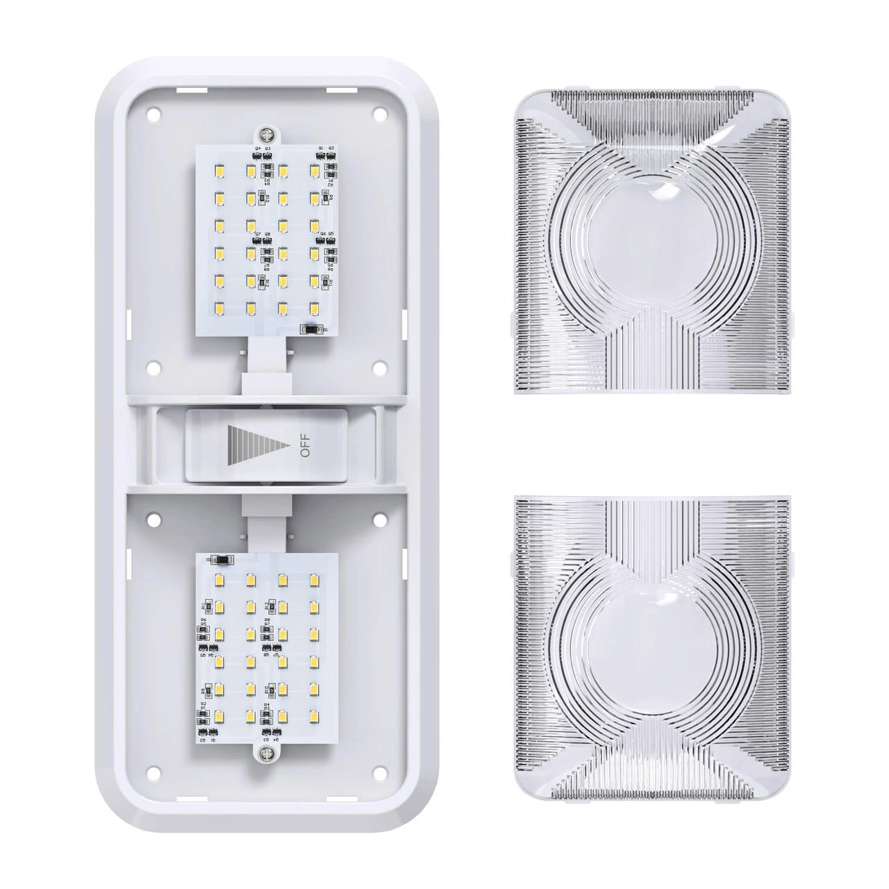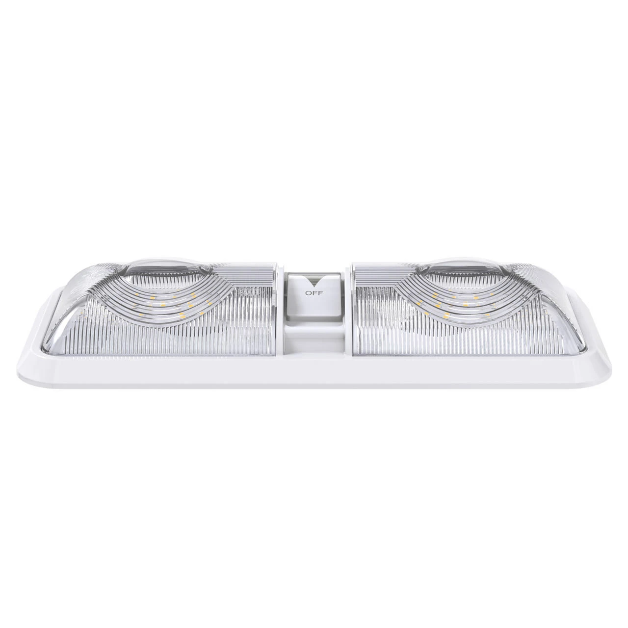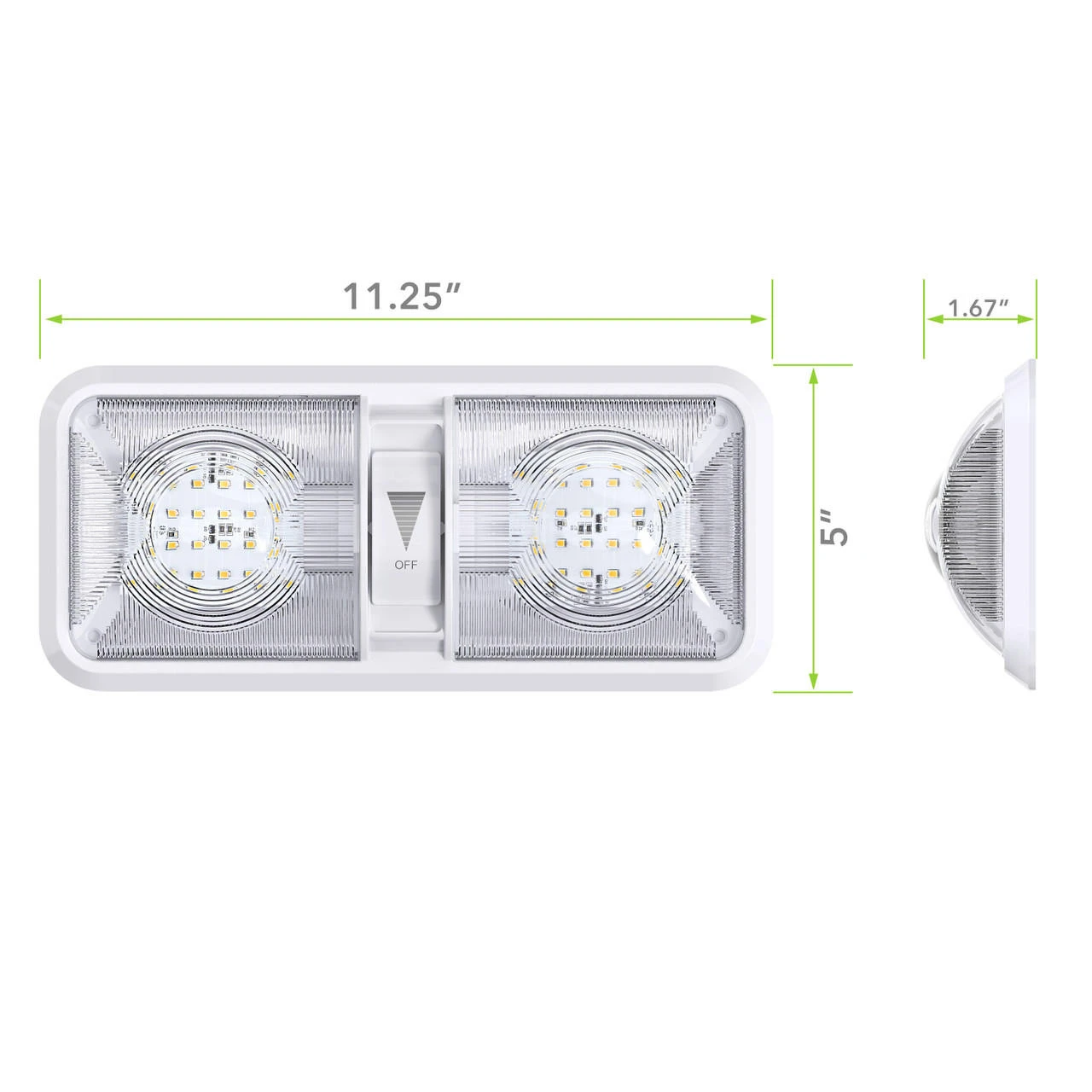 Double Dome Light Fixture 48 2835SMD chip leds, 2 x 275 Lumens Natural White With built in Dimmer switch RV, Marine & Auto 550 Total Lumen -Description- -Double Dome Light Fixture comes with two T10 Wedge panels 2 x 275 Lumens, LED Bulb -Built in Dimmer Switch -Applications include 12 Volts DC recreational vehicles. -Wide Range Use 11-18V – Color Temperature : 4000-4500K Natural White -2 x 24 High power Wedge style 2835 SMD LEDs -60,000 hour life expectancy. Last many times longer than standard light bulb -Dimensions: 11 1/4″L x 5″W x 2″H -Specification- -Fixture comes with a LED light bulb that is made with high quality SMDs