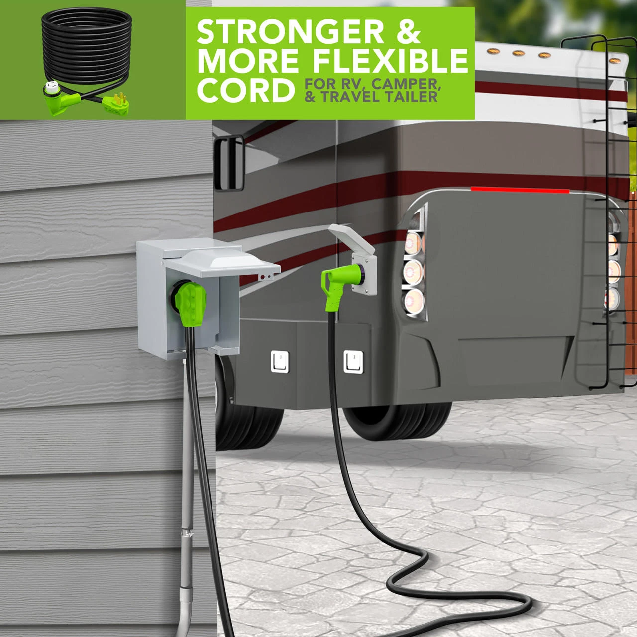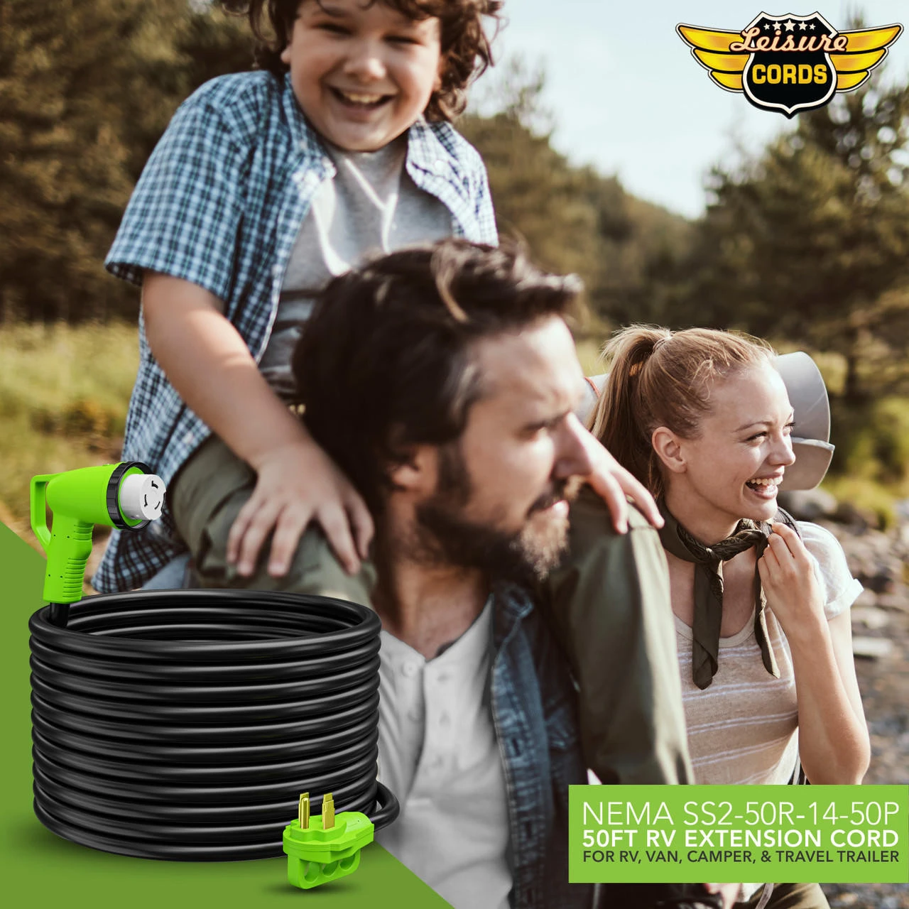 The high visibility plug ends feature a 50 Amp male 14-50P plug and an innovative SS2-50R female receptacle with a 90-degree configuration to reduce cord strain, a handle, and a green LED light indicator when you have power.