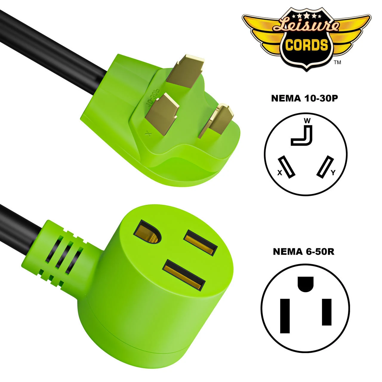 - Leisure Cords Electrical Rating: 30A (NEMA 10-30P) male to 50A (NEMA 6-50R) female adapter cord.